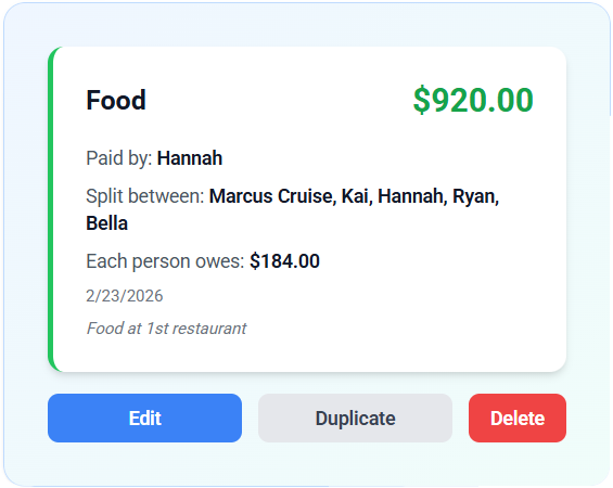 Change amounts, dates, participants, or itemized details. Balances recalculate instantly.