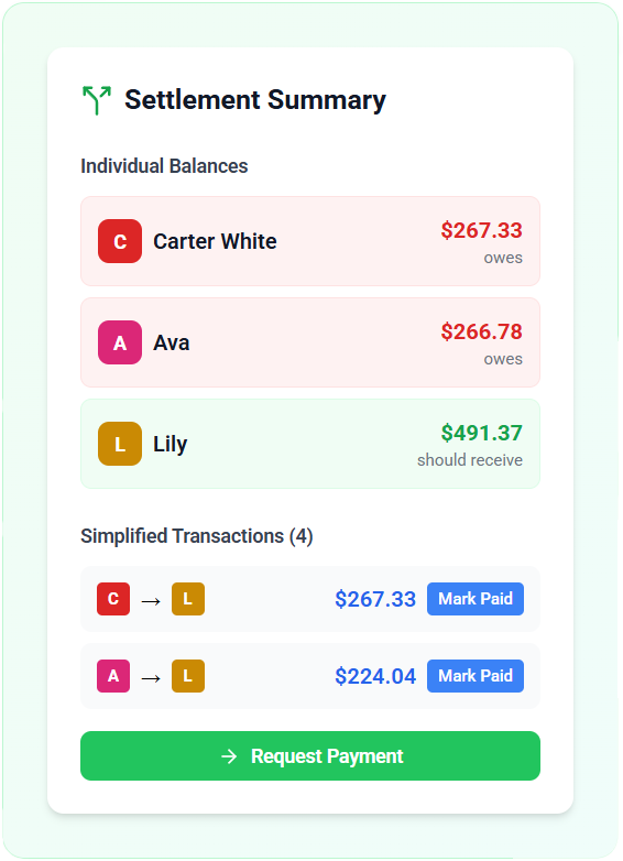 Automatic optimization finds the minimum number of transactions needed to settle all balances fairly.