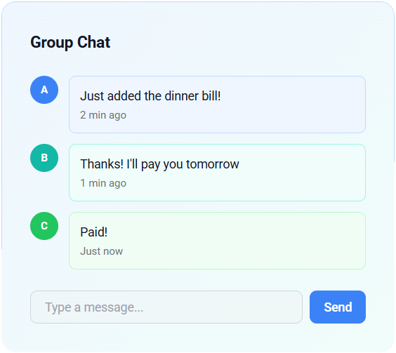 Discuss expenses without leaving the app. Coordinate payments and ask questions directly in your group.