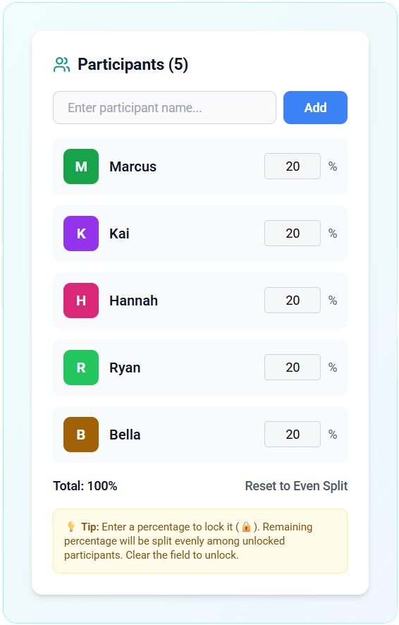 Set custom split ratios for any scenario. Lock percentages for specific people while others auto-balance the remainder.